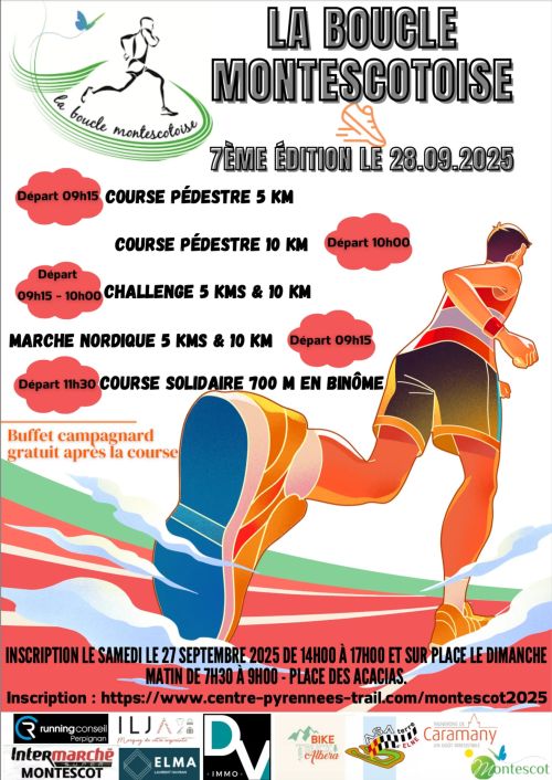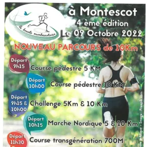 La Boucle Montescotoise est une course à pied organisée dans le village de Montescot, au cœur des Pyrénées-Orientales. Le parcours traverse des paysages variés, mêlant sentiers naturels et ruelles pittoresques, avec des vues sur la campagne environnante et les montagnes au loin. Cette course propose des distances de 5 km et 10 km, accessibles à tous les niveaux. Venez découvrir Montescot et partager un moment convivial en participant à cet événement sportif et chaleureux.