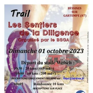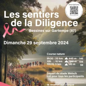Le BSGA organise sa traditionnelle course nature des sentiers de la Diligence en association avec la campagne Octobre Rose. Ainsi, pour chaque inscription, 1€ sera reversé pour la sensibilisation au dépistage du cancer du sein. Comme chaque année vous pourrez vous aventurer sur les parcours de 10 km et 20 km mais également pour la première fois sur un 5 km. Ouverte à tous les niveaux, cette course vous fera découvrir nos chemins autour de notre beau village de Bessines sur Gartempe et observer ses paysages boisés depuis ses hauteurs. Un lot est offert à tous les participants et notre buvette accueillera coureurs comme spectateurs pour profiter d'un moment sportif et de détente.