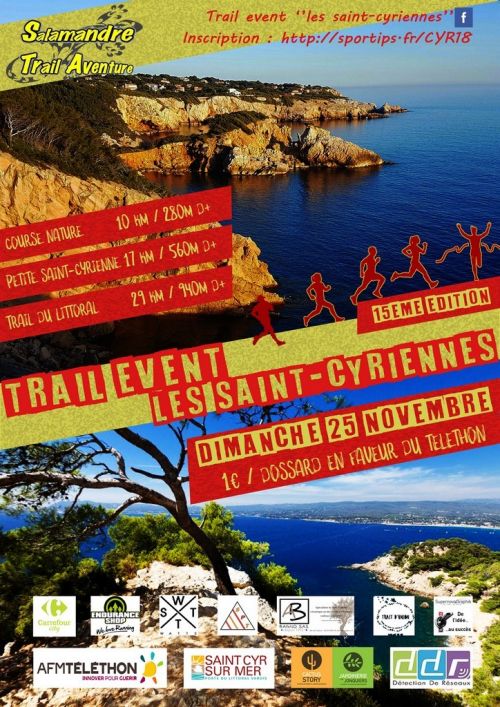 L’association "SALAMANDRE TRAIL AVENTURE" en collaboration avec la municipalité de Saint Cyr sur Mer organisent le TRAIL EVENT « Les Saint Cyriennes ». Courses pédestres sur chemins et sentiers.