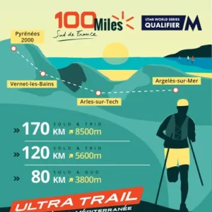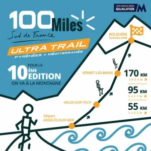Pour cette nouvelle édition, l’équipe des 100 Miles Sud de France vous offre l’opportunité unique de relier physiquement la mer à la montagne. La traversée du département des Pyrénées-Orientales le long de la frontière espagnole constitue un challenge hors norme de 170 kms et 9800 de D+. Des distances intermédiaires sont proposées avec 95km et 55km pour respectivement 5 500 et 3 200 de D+. Le départ de l’ultra sera donné sur le magnifique site du château de Valmy sur la commune d’Argelès-sur-mer au pied de la chaîne des Albères à proximité de la réserve marine du littoral catalan.