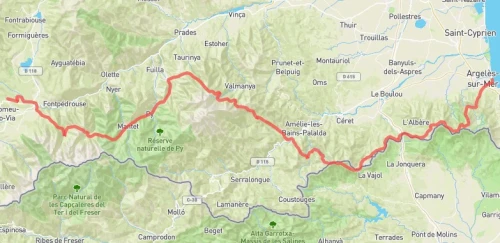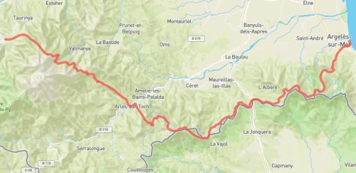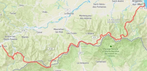 Au départ d'Arles sur Tech, votre objectif sera toujours de rejoindre la mer. Après une première montée raide vers le Col de Parasols, vous arriverez à Montalba puis Las Illas par un petit tronçon en Espagne. Il sera alors temps de quitter le Vallespir au Perthus pour rejoindre les Albères, magnifique chaîne de montagne qui se jette littéralement dans l’eau de la Méditerranée sur la plage d'Argelès sur mer.