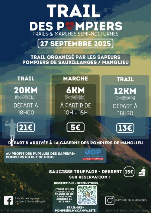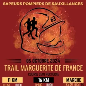 Le Trail des Pompiers se déroule à Sauxillanges, dans le Puy-de-Dôme, au cœur de l’Auvergne. Les parcours de 12 km et 20 km traversent des paysages variés, entre collines verdoyantes, forêts et chemins vallonnés, offrant une immersion dans la nature. Organisé par l’amicale des sapeurs-pompiers, cet événement solidaire soutient les pupilles des pompiers. Venez courir, découvrir la région et contribuer à une belle cause !