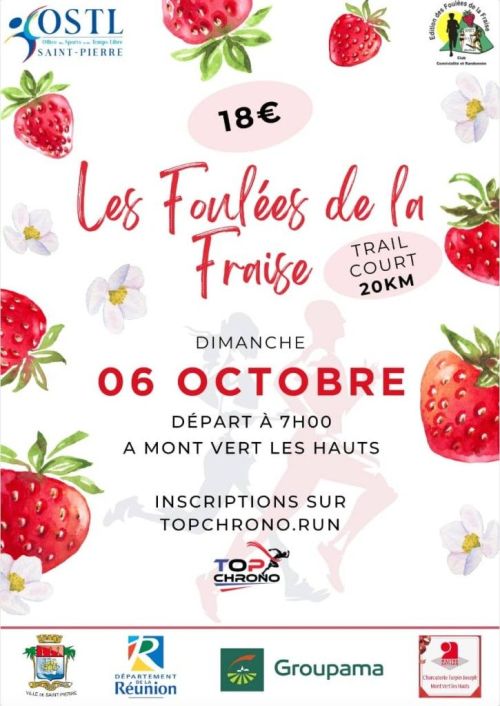 Les Foulées de la Fraise organisé par Source V Avant en collaboration avec l’OMDAR, le Service des Sport, l’OSTL et la mairie de Saint Pierre. Boucle : Départ à 7 h00 au stade de Mont Vert les Hauts // Domaine Vidot // Nouveau sentier forêt de Mont Vert // Piste forestière de Notre Dame de la Paix // sentier de la fraise // retour sur le site de la fête au Domaine Vidot.