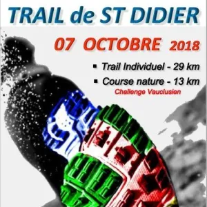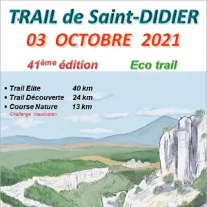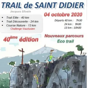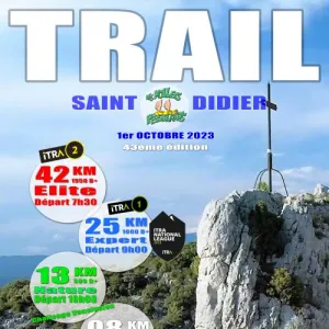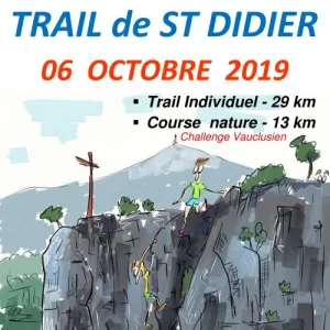 Trail de St Didier. Un maximum de sentiers monotrace très variés, parfois techniques. Les parcours traversent des paysages superbes autour de Saint Didier, les villages perchés du Beaucet et de Venasque. Les crêtes au dessus de St Gens vous permettront de découvrir des points de vues époustouflants sur les Monts de Vaucluse Seul le 13 km est inscrit au Challenge Vauclusien