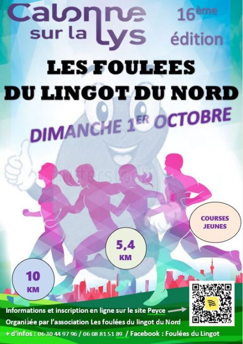Les Foulées du Lingot du Nord se déroulent à Calonne-sur-la-Lys, une commune paisible du Pas-de-Calais, au cœur des Hauts-de-France. Les parcours plats, sur routes de campagne, offrent un cadre agréable pour courir. Avec des distances adaptées à tous, du 600 m pour les enfants au 10 km pour les adultes, chacun peut relever son défi. Participez pour partager un moment convivial, vous dépasser et soutenir une cause solidaire. Inscrivez-vous et venez courir avec nous !
