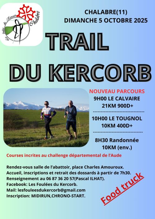 L’Association « Les Foulées du Kercorb » organise un ‘trail découverte’ , un trail court ainsi qu’une randonnée pédestre sur la commune de Chalabre. Les départs seront donnés depuis la place Charles Amouroux(salle de l'abattoir) de Chalabre.