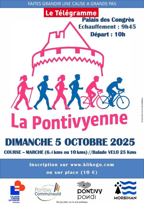 La Pontivyenne est une course solidaire contre le cancer, organisée à Pontivy, en plein cœur du Morbihan, en Bretagne. Le parcours traverse le centre-ville et longe le Blavet, offrant un cadre agréable entre nature et patrimoine. Accessible à tous, coureurs ou marcheurs, elle propose des distances de 6,2 km et 10 km, ainsi qu’un circuit cyclo. Participer, c’est soutenir la lutte contre le cancer tout en partageant un moment convivial. Rejoignez-nous pour cette cause essentielle !