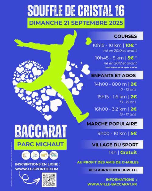 La course Souffle de Cristal se déroule à Baccarat, en Meurthe-et-Moselle, au cœur de la Lorraine. Ce rendez-vous sportif propose des parcours de 5 et 10 km, mêlant routes urbaines et sentiers naturels. Les coureurs traversent des paysages verdoyants, longeant forêts et rivières, dans une ville réputée pour son patrimoine cristallier. Venez courir ou marcher pour soutenir une cause solidaire dans un cadre agréable.