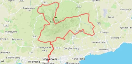 Sentiers pittoresques du parc national de Hallasan sur l'île de Jeju, pour un dénivelé cumulé de 2300 mètres. Il s'agit d'un parcours difficile qui comprend l'ascension de 1700 m du volcan Hallasan.