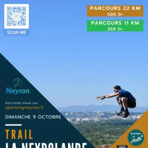 La Neyrolande est une course de trail organisée à Neyron, un petit village de l'Ain situé au bord du Rhône, à proximité de Lyon. Elle propose trois parcours adaptés à différents niveaux : 11 km avec 250 m de dénivelé positif, 22 km avec 500 m et 33 km avec 1000 m, traversant la commune et ses environs vallonnés. Rejoignez cet événement pour découvrir un cadre naturel accessible, profiter d'une organisation soignée avec ravitaillements et vestiaires, et partager un moment convivial avec d'autres coureurs.