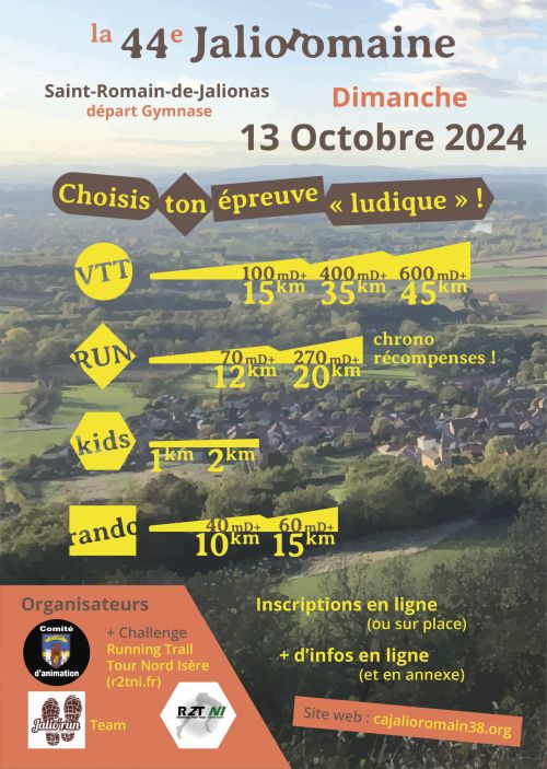 La Jalioromaine avec 2 courses chronométrées : Un Trail découverte d’environ 20 km sur les sentiers et chemins forestiers de l’Isle Crémieu et un Cross de 13 km sur les sentiers et chemins forestiers de St Romain de Jalionas.