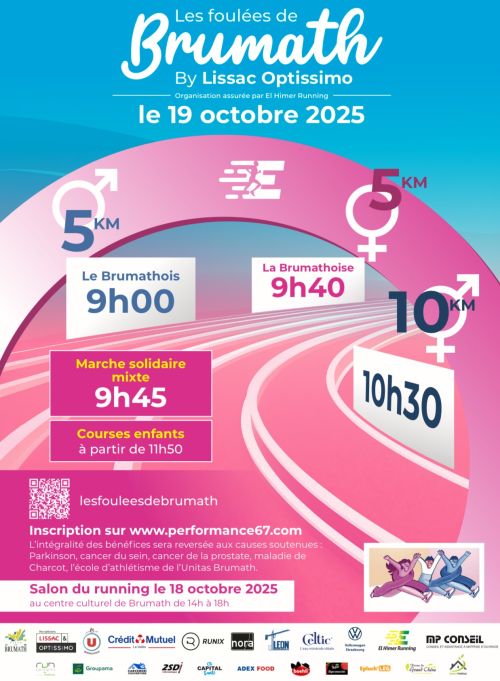 Les Foulées de Brumath avec course mesurée, marche solidaire et courses enfants au programme, il y en aura pour tous les goûts ! Impulsées par l’équipe El Himer Running et ses bénévoles, les Foulées de Brumath by Lissac & Optissimo proposent une formule revisitée des anciennes Courses de Brumath.