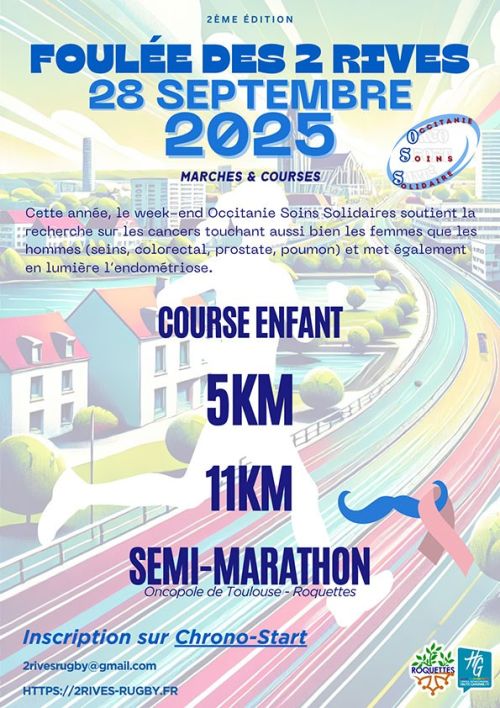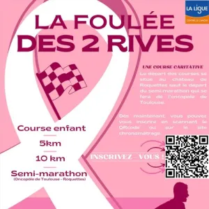 La Foulée des 2 Rives est un événement sportif organisé à Roquettes, en Haute-Garonne, par le club 2 Rives Rugby, en partenariat avec la mairie et les associations locales. Les parcours, de 5 à 21 km, mêlent routes et chemins avec peu de dénivelé, traversant les paysages apaisants des bords de Garonne et des espaces naturels environnants. Cette course caritative soutient la lutte contre le cancer et l’endométriose. Venez courir ou marcher dans un cadre convivial, au départ du château de Roquettes ou de l’Oncopole de Toulouse, et participez à une belle cause !