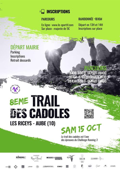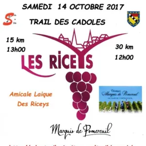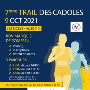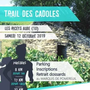 Le Trail des Cadoles est la 7ème étape du CTR3. Il se dispute dans le sud du département de l'Aube, depuis le renommé village Les Riceys (Haute-rive) au centre de ses trois bourgs étagés au fil de la Laigne. Bien vallonnés, ses trois parcours vous offriront les dénivelés Aubois parmi les plus important.