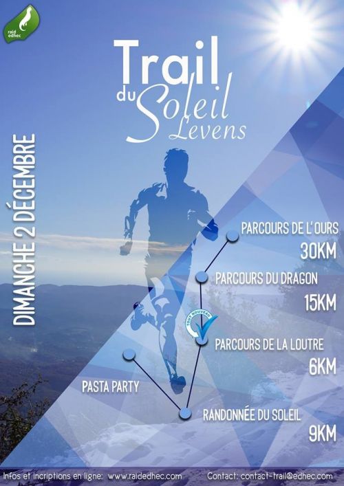 La 4ème édition du trail du soleil levens, organisée par l’association raid edhec, se déroulera à levens, près de nice, avec 700 participants attendus. 4 parcours seront proposés : 29,3km ; 15,6km ; 6,3km et enfin une randonnée de 9,5km.