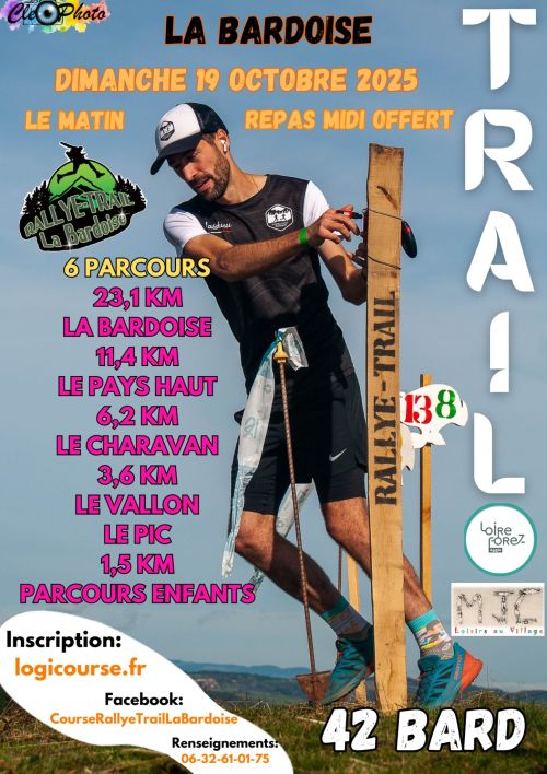 La Bardoise est un rallye-trail organisé par la MJC Loisirs au village de Bard, en Loire. Ce parcours de 23 km, alternant sections chronométrées sur sentiers et liaisons libres, traverse les reliefs et chemins naturels du lieu, dans une ambiance conviviale. Ouverte à tous, des débutants aux confirmés, elle propose un repas local en fin de matinée. Rejoignez-nous pour une expérience simple en pleine nature, accessible et partagée.