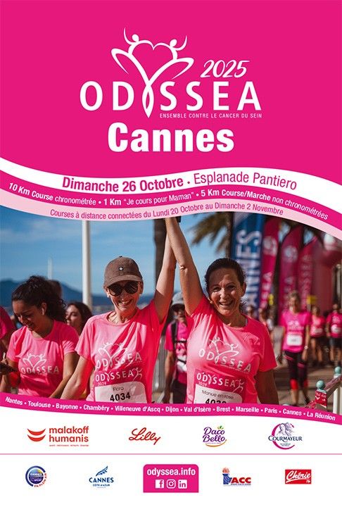 L'Odysséa Cannes est une course solidaire ouverte à tous, dédiée à la lutte contre le cancer du sein. Elle se déroule à Cannes, sur le boulevard du Midi Louise Moreau, le long des plages méditerranéennes et à proximité de la Croisette. Rejoignez cet événement pour allier effort physique et engagement collectif, en famille ou entre amis, et contribuer simplement à une cause utile.