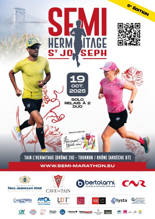 1ère édition du Semi Marathon Hermitage St Joseph qui reliera les deux célèbres appellations viticoles en partant de Tournon, en Ardèche, pour arriver de l'autre côté de la rive du Rhône sur Tain l'Hermitage, dans la Drôme.