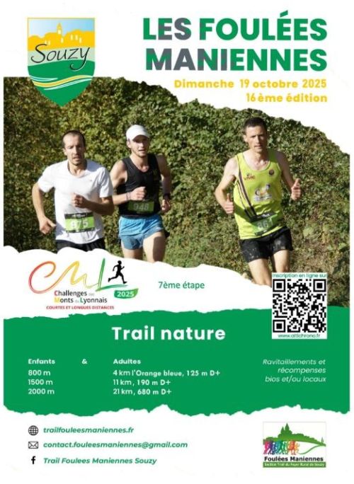 Le Trail des Foulées Maniennes est organisé par la section "Les Foulées Maniennes", section sportive placée sous la tutelle de l'association "Le Foyer Rural de Souzy". Trois courses enfants sont organisées (800 m, 1500 m et 2000 m), elles ne sont pas chronométrées. Lieu de l’épreuve : Souzy, départ et arrivée salle polyvalente. Parcours sur des chemins : 80% pour les adultes, 100% pour les enfants. Course ouverte aux femmes et aux hommes, licenciés (FFA/FFTRI) et aux non licenciés.