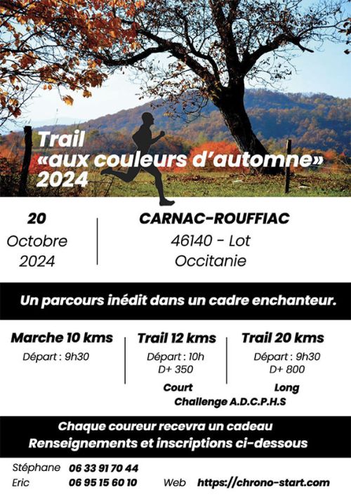 Le Trail aux Couleurs d'Automne est une course nature qui se déroule à Carnac-Rouffiac, un village du Lot niché près de la vallée du Lot et du Quercy blanc. Les parcours, entre monotraces boisés, montées et passages techniques, invitent à une découverte paisible des paysages automnaux. Rejoignez cet événement convivial pour un moment de sport partagé et une balade accessible à tous.