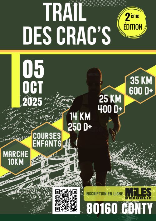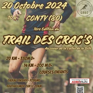 Trail proposant 3 distances: 14 , 25 et 35km, entre 200 et 600m de D+, parcours enfants, marche non chronométrée. Circuits tracés en plaine et sous bois, traversant les vallées des Evoissons et de la Selle, le bois et les étangs de Conty. Ravitaillement intermédiaire sur le 35 et 20, pour tous sur les 3 distances. Buvette, cadeaux finishers, podiums, animations , etc...