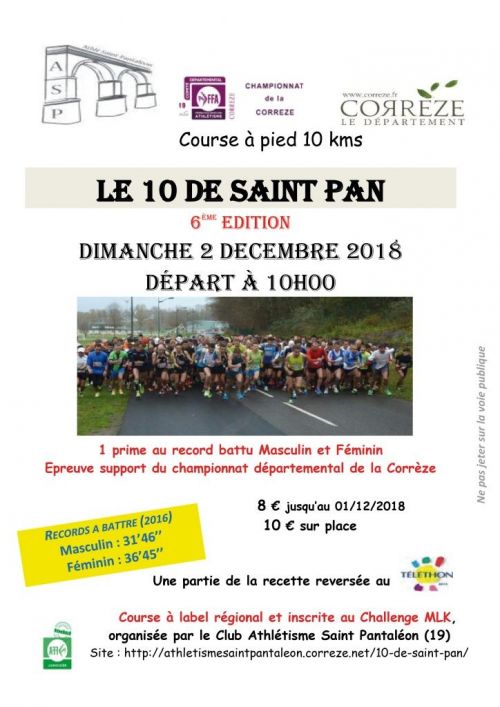 Le 10 de Saint Pan est qualificatif pour les championnats de France des 10 kms. La course se déroulera sur le même parcours que les éditions précédentes plat et sans difficulté. Elle est ouverte à tous quelque soit votre niveau de pratique Le départ se fera un peu avant le pont qui enjambe la Vézère à l'entrée de Saint-Pantaléon et l'arrivée près de l'espace vézère Causse au centre du bourg.