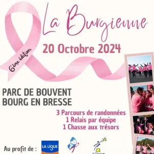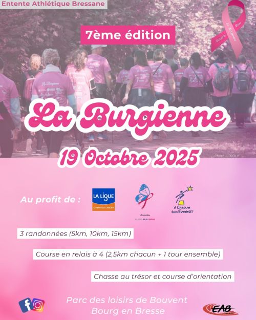 La Burgienne est un événement organisé par l'Entente Athlétique Bressane (club d'athlétisme de Bourg en Bresse) dans le cadre du mois d'information d'Octobre Rose. Evénement au profit de la prévention, du dépistage et de la lutte contre le cancer du sein. Tous les bénéfices de cette manifestation iront à des associations en lien avec la cancérologie. 3 marches : 5km / 10km / 15 km 1 relai : 4x2.5km + un tour ensemble Course d'orientation et chasse au trésor