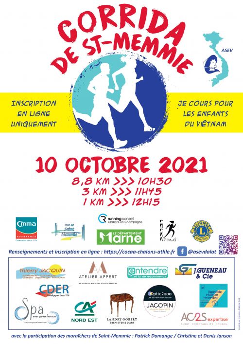 La Corrida de Saint-Memmie est une course à pied solidaire, organisée au cœur de cette commune calme de la Marne, en région Grand Est, à proximité de Châlons-en-Champagne. Elle propose un parcours de 8,8 km adapté aux coureurs de plus de 16 ans, ainsi qu'une épreuve de 3 km ouverte aux jeunes. Les fonds récoltés soutiennent des actions pour les enfants orphelins au Vietnam. Rejoignez cet événement pour allier effort physique et geste utile, dans une atmosphère conviviale.