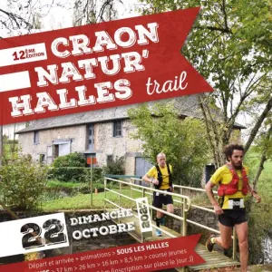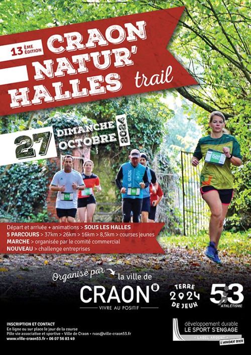 Craonnatur'halles trail avec 5 courses au programme. Ce trail permet d'allier une épreuve sportive à une découverte du patrimoine craonnais L'an dernier, notre manifestation a été labellisée de la médaille de bronze dans le cadre du projet "Développement durable, le sport s'engage" organisé par le Comité National Olympique et Sportif Français. Nous chercherons à être encore plus proche de nos coureurs et de notre objectif d'un trail vert, puis que nous repostulons sur ce label.