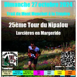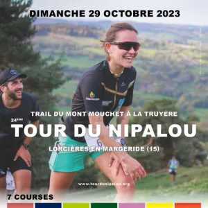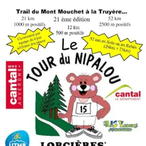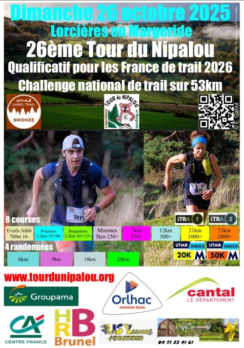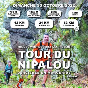 Le Tour du Nipalou aura lieu à Lorcières en Margeride (Cantal, Auvergne). 8 distances de course pour toutes les catégories. de 0,7km pour les éveil athlé, 1,2km pour les poussins, 2,2km pour les benjamins, 5km pour les minimes, 7km à partir de cadet, 12km à partir de junior, 21 et 53km à partir d'espoir. Le 21 et le 53 km sont labellisés FFA et qualificatifs pour les championnats de France de trail. Ils permettent également de marquer des points pour l'Ultra Trail du Mont-Blanc et au barème ITRA. En parallèle quatre distances de randonnées sont proposées. 6; 9, 18 et 20km. Repas sur place servi en continu de 12h à 18h avec aligot maison.