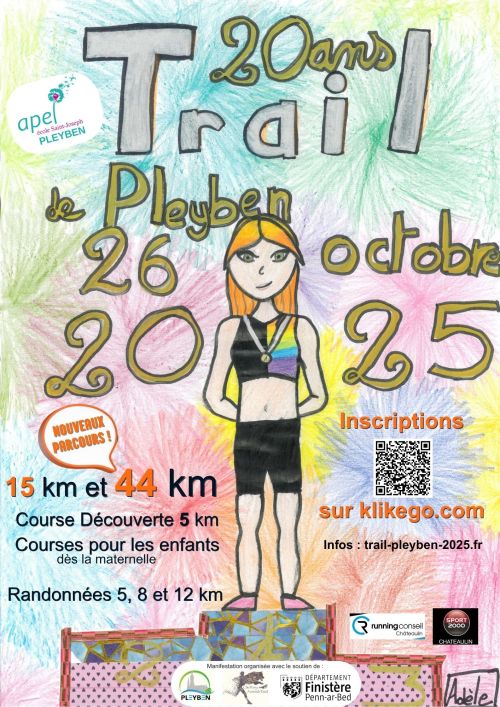 L’APEL de l’école Saint Joseph organise le traditionnel Trail de Pleyben. Le parcours vous fera découvrir la campagne pleybennoise tout au long d’un tracé mêlant les sous bois, prairies, chemins creux et passages de rivières, tous les ingrédients des amateurs des courses en nature. L’épreuve fait partie du challenge Armorik Trail dont c’est la troisième édition. La remise des récompenses du challenge aura lieu directement après les courses. 3 Distances proposées 5, 12 et 22 km au départ du gymnase Pierre Cloarec
