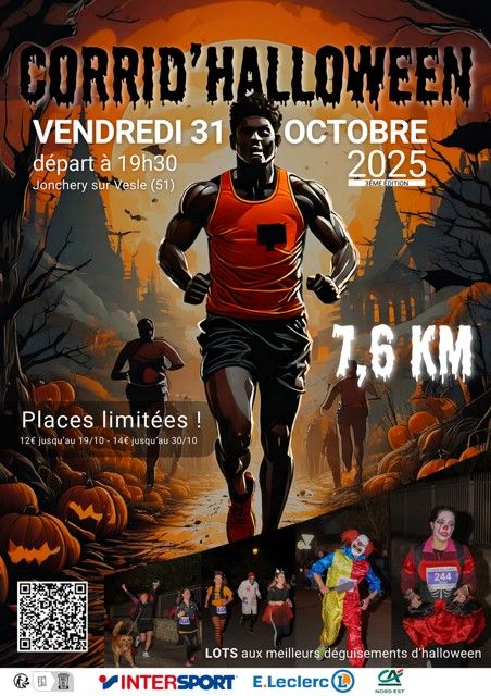 La Corrid'Halloween est une course à pied nocturne de 7,6 km qui se déroule en trois boucles au cœur du village de Jonchery-sur-Vesle, en Marne, au bord de la Vesle. Ce parcours routier, accessible dès 16 ans, invite à une ambiance conviviale et thématique. Rejoignez-nous pour allier effort physique et esprit festif, dans un cadre local simple et accueillant.