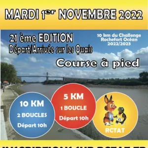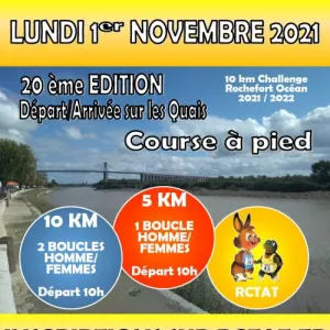 La Course du 1er Novembre se déroule à Tonnay-Charente, commune riveraine de la Charente entre Rochefort et Saintes. Parcours varié le long du fleuve et dans les rues calmes. Une occasion simple de courir ensemble et de soutenir l'événement local. Inscrivez-vous et participez.