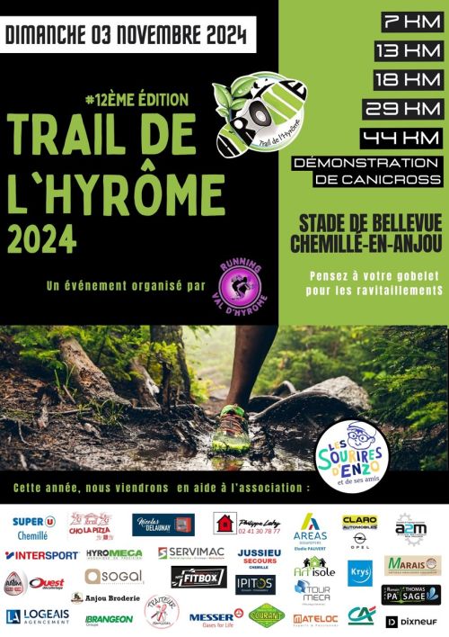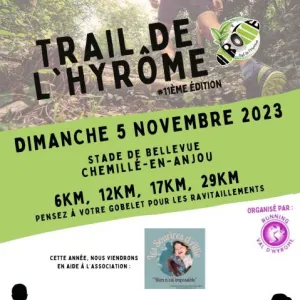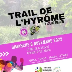 Le Trail de l'Hyrôme est une course nature organisée à Chemillé-Melay, dans le Maine-et-Loire, au cœur du Val d'Hyrôme. Les parcours, qui s'étendent sur les communes voisines comme Chanzeaux et Saint-Lambert-du-Lattay, suivent des sentiers variés le long de la rivière, à travers forêts et reliefs modérés. Rejoignez cet événement pour découvrir un cadre naturel accessible et partager une ambiance conviviale avec d'autres coureurs.