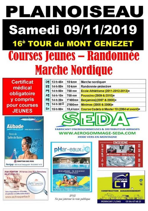 L'association de PLainoiseau "Les Coureurs du Mont Genezet" , sera heureuse de vous accueillir sur sa course nature. Cette édition se déroulera avec un départ et arrivée à Plainoiseau. Au programme, marche populaire et nordique, courses enfants, et la traditionnelle course sur 10,4 km, entre Plainoiseau et l'Etoile.