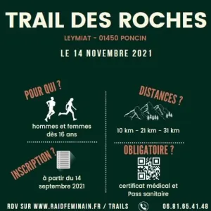 Le Trail des Roches est une course nature qui se déroule à Poncin, commune de l'Ain située dans la région du Bugey, au cœur de paysages variés mêlant vignobles, forêts et sentiers escarpés le long de la rivière d'Ain. Avec des parcours de 10, 21 ou 32 km adaptés à différents niveaux, elle invite à découvrir un territoire authentique et préservé. Rejoignez cet événement pour progresser en endurance, profiter d'une ambiance conviviale et vous ressourcer au contact de la nature.