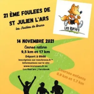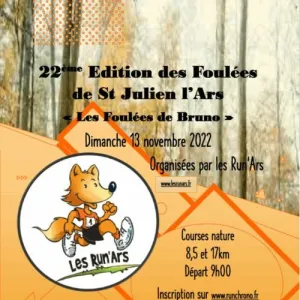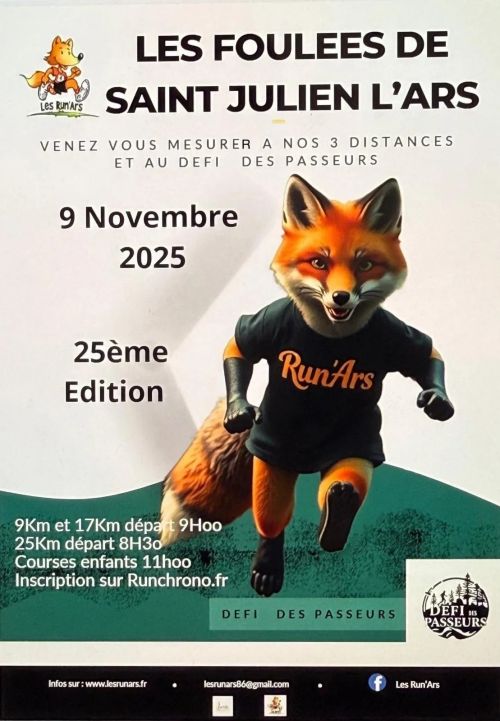 Les Foulées de Saint-Julien-l'Ars sont une course nature organisée dans la commune de Saint-Julien-l'Ars, située en Vienne, en Nouvelle-Aquitaine, au cœur d'un paysage rural calme et verdoyant. Avec des parcours de 8,5 km, 17 km et 25 km adaptés à divers niveaux, cette épreuve invite à découvrir les sentiers locaux à un rythme personnel. Rejoignez-nous pour ce moment convivial qui permet de bouger, de partager avec d'autres coureurs et de profiter simplement d'une sortie en pleine nature.