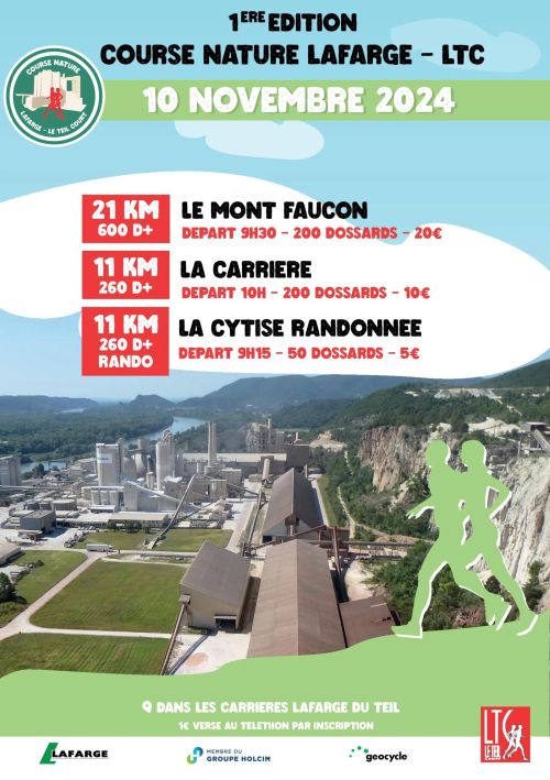 La Course Nature Lafarge - LTC est un événement de trail organisé à Le Teil, en Ardèche, au cœur d'un paysage vallonné et naturel. Le départ et l'arrivée ont lieu sur le site de l'usine Lafarge, offrant des parcours de 11 km et 21 km adaptés aux coureurs en solo ou en duo, ainsi qu'une randonnée sur le tracé de 11 km. Rejoignez-nous pour profiter d'une sortie en pleine nature, partager un moment convivial et soutenir une œuvre caritative grâce aux inscriptions.