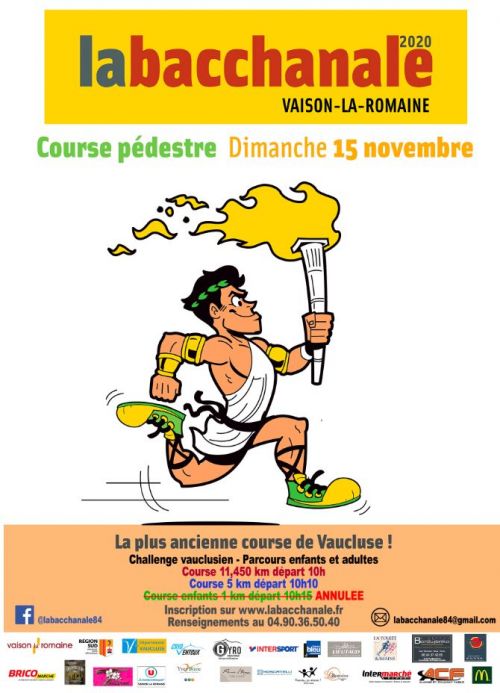 La Bacchanale, la plus ancienne course de Vaucluse ! Cette épreuve de course à pied organisée par la Ville de Vaison-la-Romaine et l’association La Bacchanale, créé récemment, prendra son départ à 10h, sur l’avenue Mitterrand. Les enfants ont également leur course dédiée.