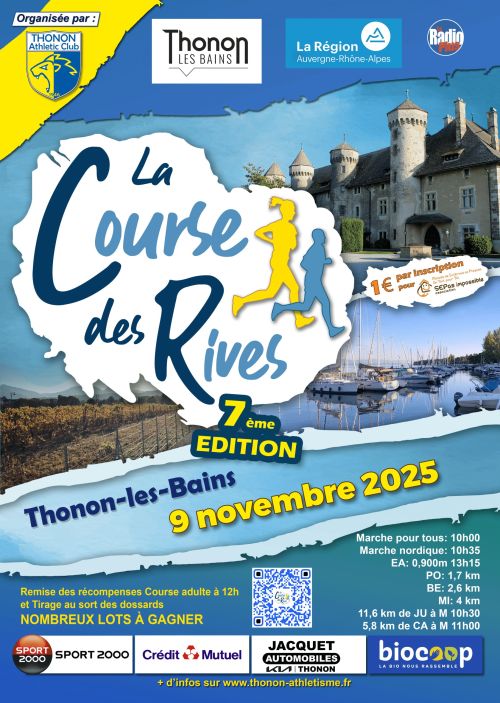 La Course des Rives propose des parcours de 5,6 km et 11,6 km sur route, au départ du port de Thonon-les-Bains, le long des rives du lac Léman avec vue sur les montagnes. Ouverte à tous les niveaux, elle inclut aussi une marche et des courses enfants. Venez courir dans ce cadre naturel pour partager un moment convivial et vous dépasser en toute simplicité.