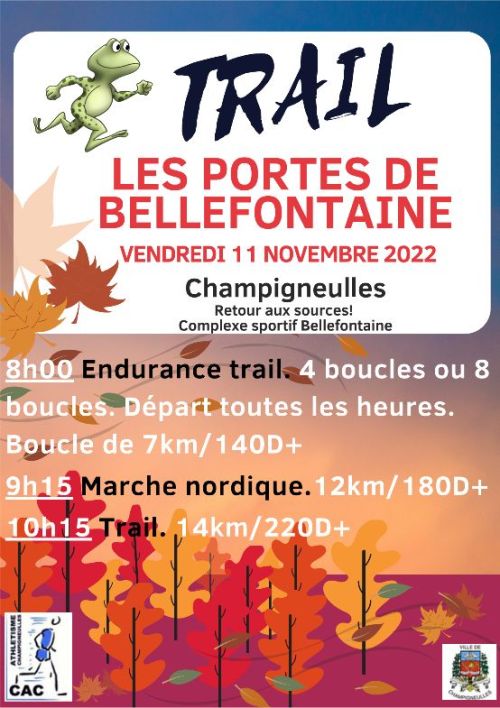 L'Endurance Trail de Bellefontaine est une course nature organisée à Champigneulles, en Meurthe-et-Moselle, au cœur d'un cadre boisé et vallonné de la région Grand Est. Elle propose des parcours variés, adaptés à différents niveaux, sur des sentiers accessibles et bien balisés. Rejoignez cet événement pour tester votre endurance en pleine nature, partager un moment convivial avec d'autres coureurs, et profiter d'une organisation soignée avec ravitaillements et soutien sur place. Inscrivez-vous pour une expérience simple et enrichissante.
