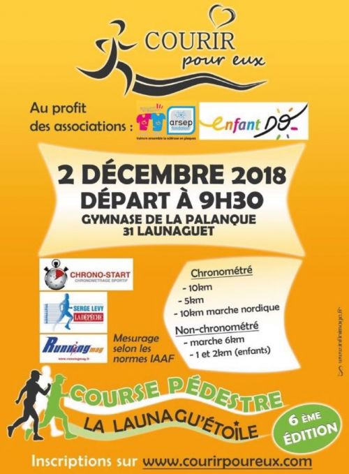 La Launagu’étoile est une course organisée par l’Association « COURIR POUR EUX », dont l’intégralité des bénéfices sera reversée, pour l’édition 2018, au profit de la Fondation pour l’Aide à la Recherche sur la Sclérose en Plaques (ARSEP) et de l'association Enfant DO (Prise en charge de la douleur, soins palliatifs et traitements lourds chez les enfants hospitalisés).