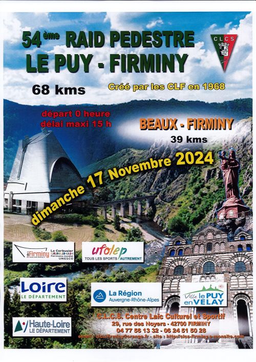 Le Raid Pédestre Le Puy - Firminy est une épreuve de randonnée et de course à pied de 69 km, reliant Le Puy-en-Velay, au cœur de la Haute-Loire, à Firminy dans la Loire voisine. Le parcours traverse les gorges de la Loire, l'Emblavez et les monts du Velay, avec environ 1 500 m de dénivelé positif, en grande partie de nuit. Une option plus courte de 39 km part de Beaux. Organisé par le CLCS de Firminy depuis 1968, cet événement réunit marcheurs et coureurs dans une ambiance conviviale. Rejoignez-le pour affronter ce défi accessible et profiter des paysages naturels de la région Auvergne-Rhône-Alpes.