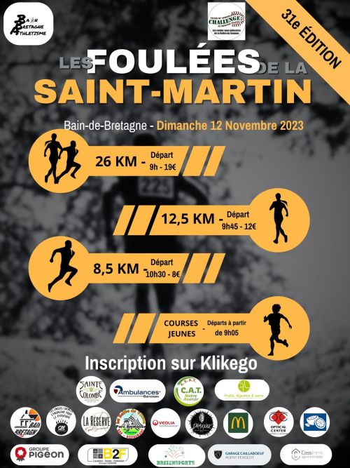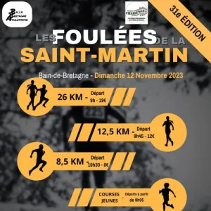 Les Foulées de la Saint-Martin est une course à pied organisée à Bain-de-Bretagne, commune située au sud de Rennes en Ille-et-Vilaine, dans un cadre rural breton. Cet événement convivial propose plusieurs parcours adaptés à différents niveaux. Participez pour partager un moment sportif et découvrir la région.