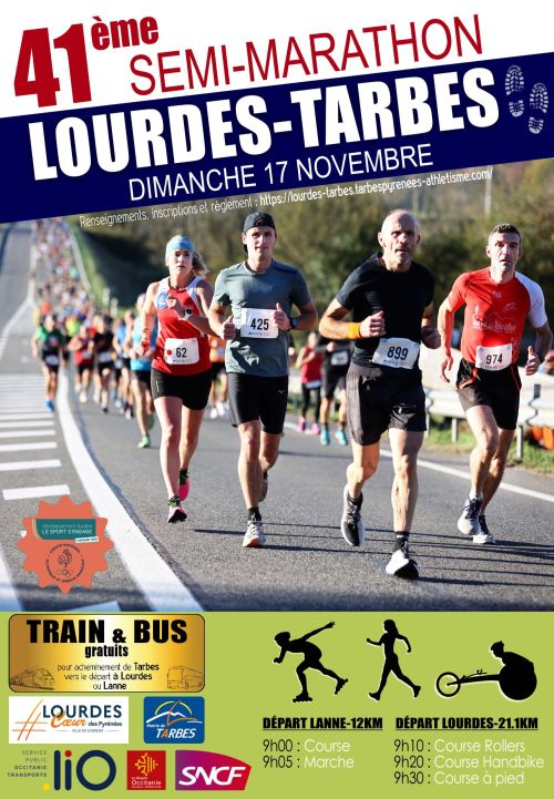 Le Semi-Marathon Lourdes-Tarbes est une épreuve de 21,1 km sur route, reliant la ville de Lourdes, dans les Hautes-Pyrénées, à Tarbes, au cœur de l'Occitanie. Ce parcours plat traverse des paysages vallonnés des Pyrénées, au départ de la place Capdevielle à Lourdes et à l'arrivée à la Halle Marcadieu de Tarbes. Organisée par le Tarbes Pyrénées Athlétisme, elle accueille coureurs, rollers et handisports dans une ambiance conviviale. Rejoignez cet événement pour progresser à votre rythme et partager un moment de sport accessible à tous.