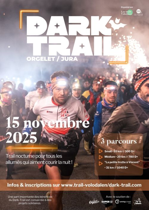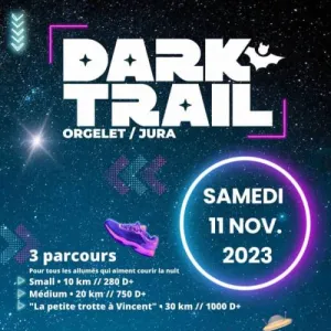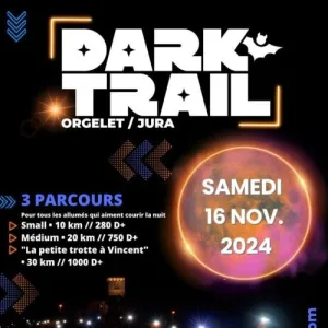 Le Dark Trail est un trail nocturne organisé à Orgelet, charmant village du Jura blotti sur un éperon rocheux autour du Mont Orgier. Équipé d'une frontale, parcourez les sentiers vallonnés des collines environnantes sur des distances de 10, 20 ou 31 km. Venez tester vos limites dans la nuit jurassienne et soutenez des actions solidaires pour l'enfance.
