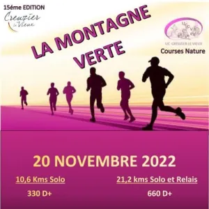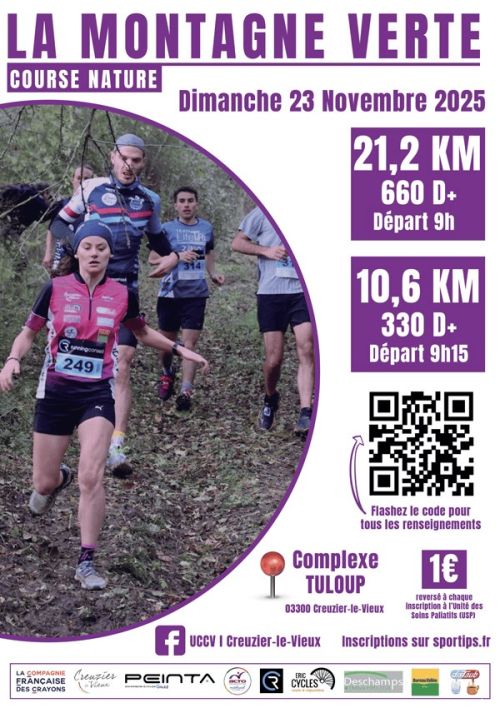 La Montagne Verte est un trail nature organisé à Creuzier-le-Vieux, commune située dans l'Allier, en Auvergne, au cœur d'une campagne vallonnée proche de Vichy. Les parcours, de 10,6 km ou 21,2 km, suivent les chemins des crêtes locales, offrant un dénivelé modéré sur des sentiers naturels. Rejoignez cet événement convivial pour découvrir les paysages environnants et partager un moment de course simple et accessible à tous les niveaux.