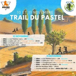 Le Trail du Pastel c'est un week-end 100 % trail composé de 3 parcours trail, marche nordique et courses enfants à Balma, dans la périphérie toulousaine, sur des sentiers vallonnés entre coteaux et plaines agricoles. Ce parcours nature offre une découverte accessible du Lauragais.