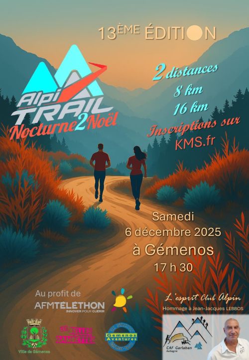 Le club alpin Garlaban en Provence en partenariat avec Gémenos aventure organise à l'occasion du téléthon la 10ème édition de l'Alpin trail nocturne de Noël. 2 parcours vous sont proposés. Pour les enfants, nous mettrons en place des parcours l'après-midi dans le parc Albertas.