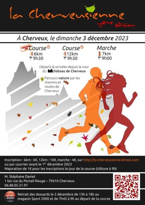 La Cherveusienne est une course à pied organisée par l'Amicale Rurale de Cherveux, dans le village de Cherveux, situé en Nouvelle-Aquitaine, dans les Deux-Sèvres. Le parcours, qui part de la cour du château, propose des distances de 6 et 12 km à travers un cadre rural calme et boisé. Rejoignez cet événement convivial pour partager un moment de sport accessible à tous les niveaux, et profiter d'une belle matinée en pleine nature. Inscrivez-vous et venez courir avec nous.